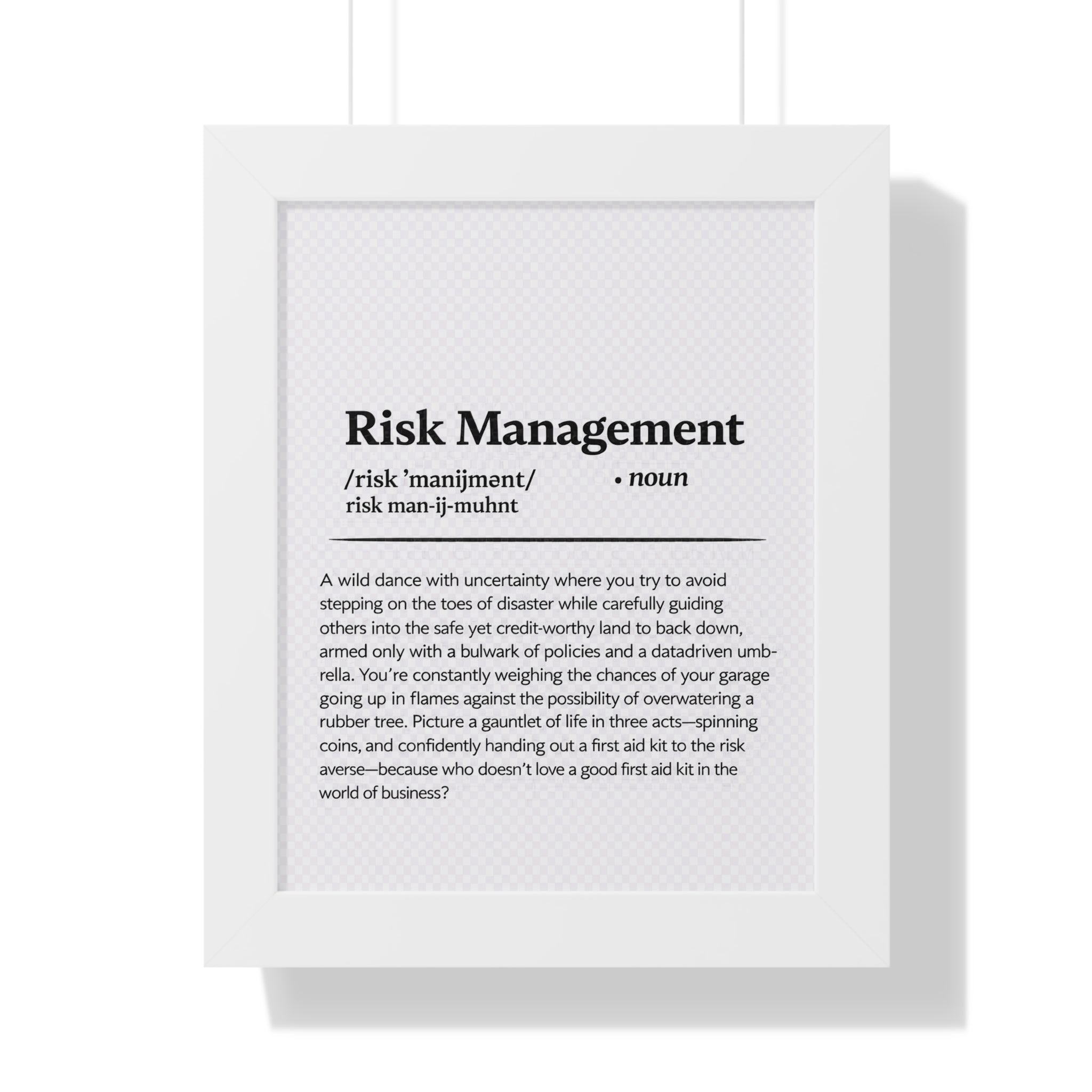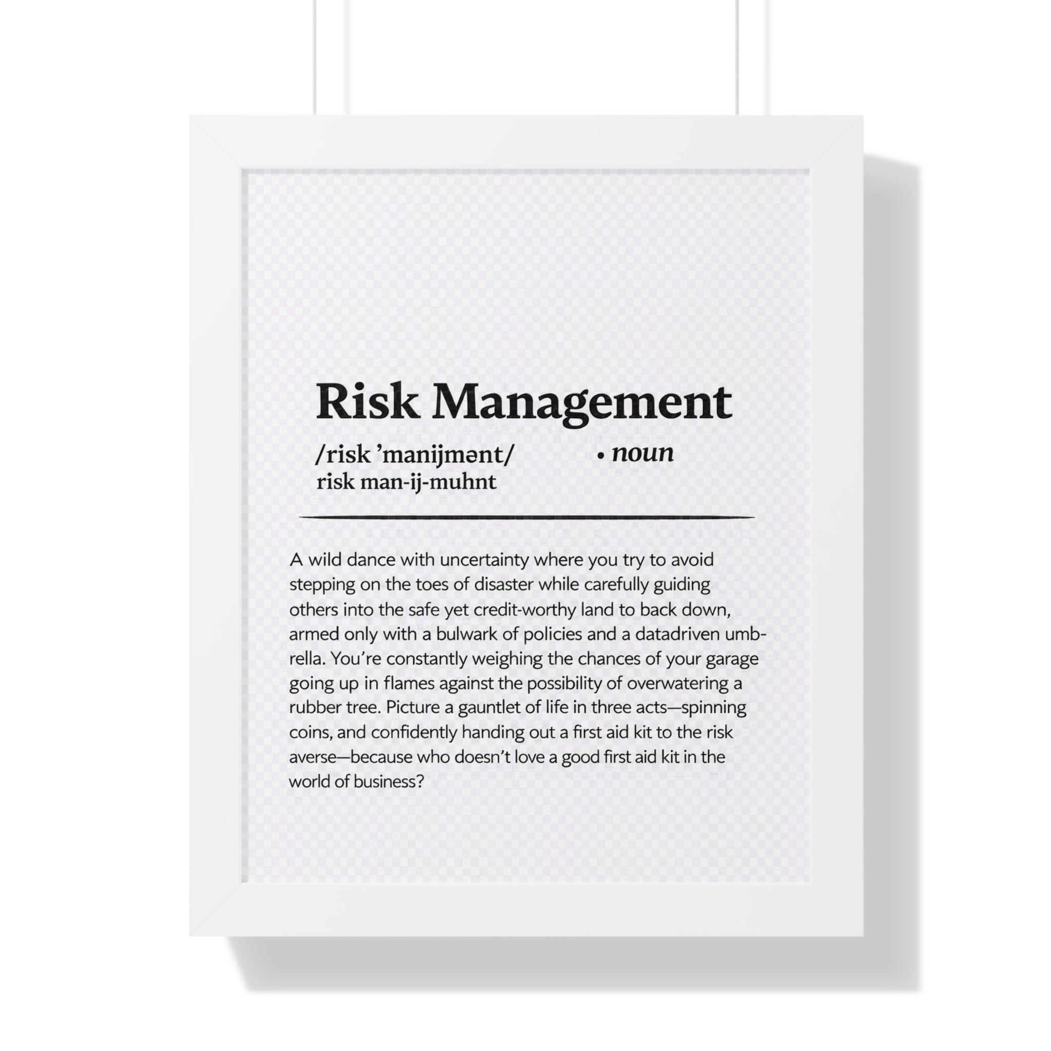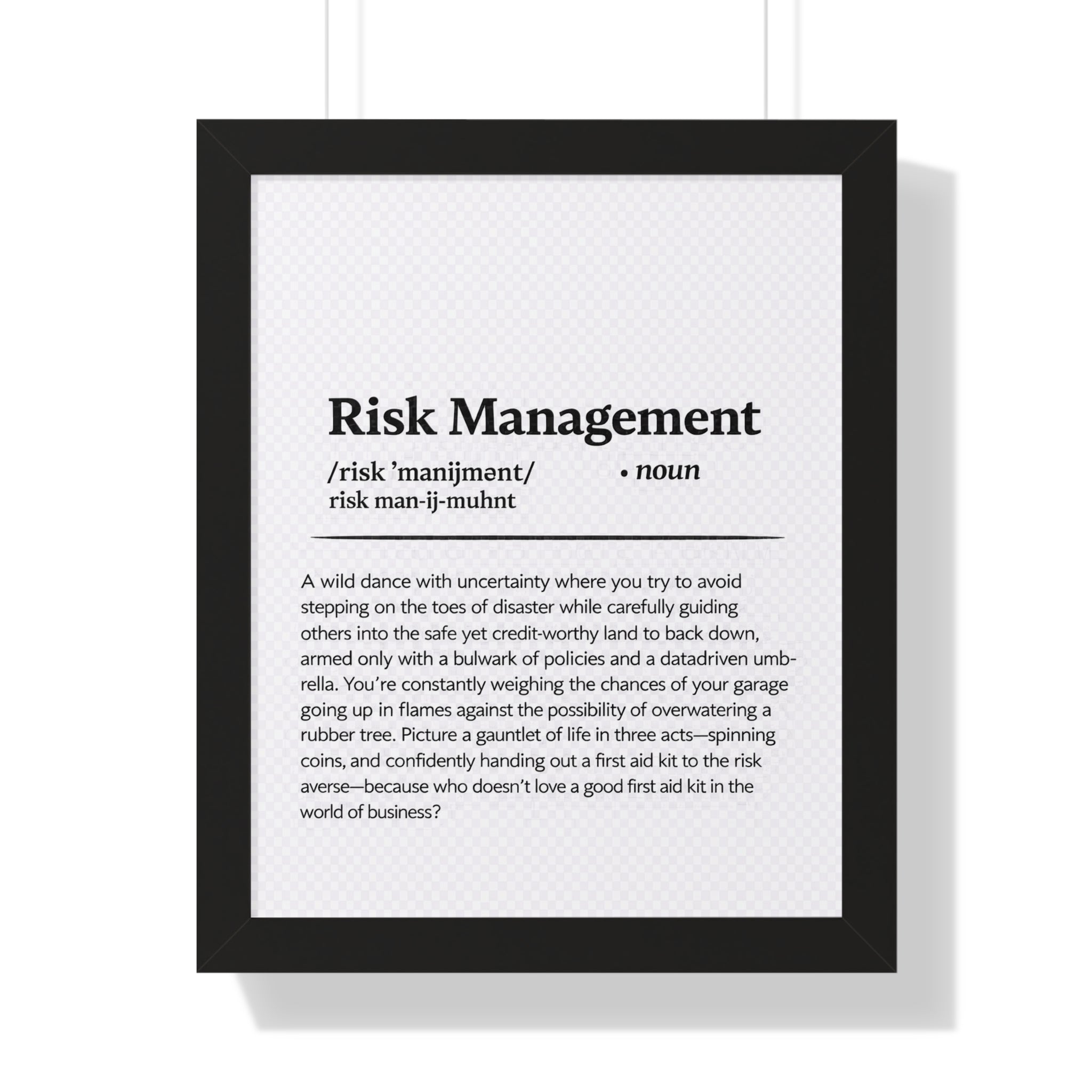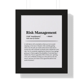 Bring clarity, confidence, and a touch of wit to your workspace with this Risk Management definition print. Designed in a clean, dictionary-style layout, this piece blends professional insight with subtle humor—perfect for insurance offices, home workspaces, or conference rooms.
